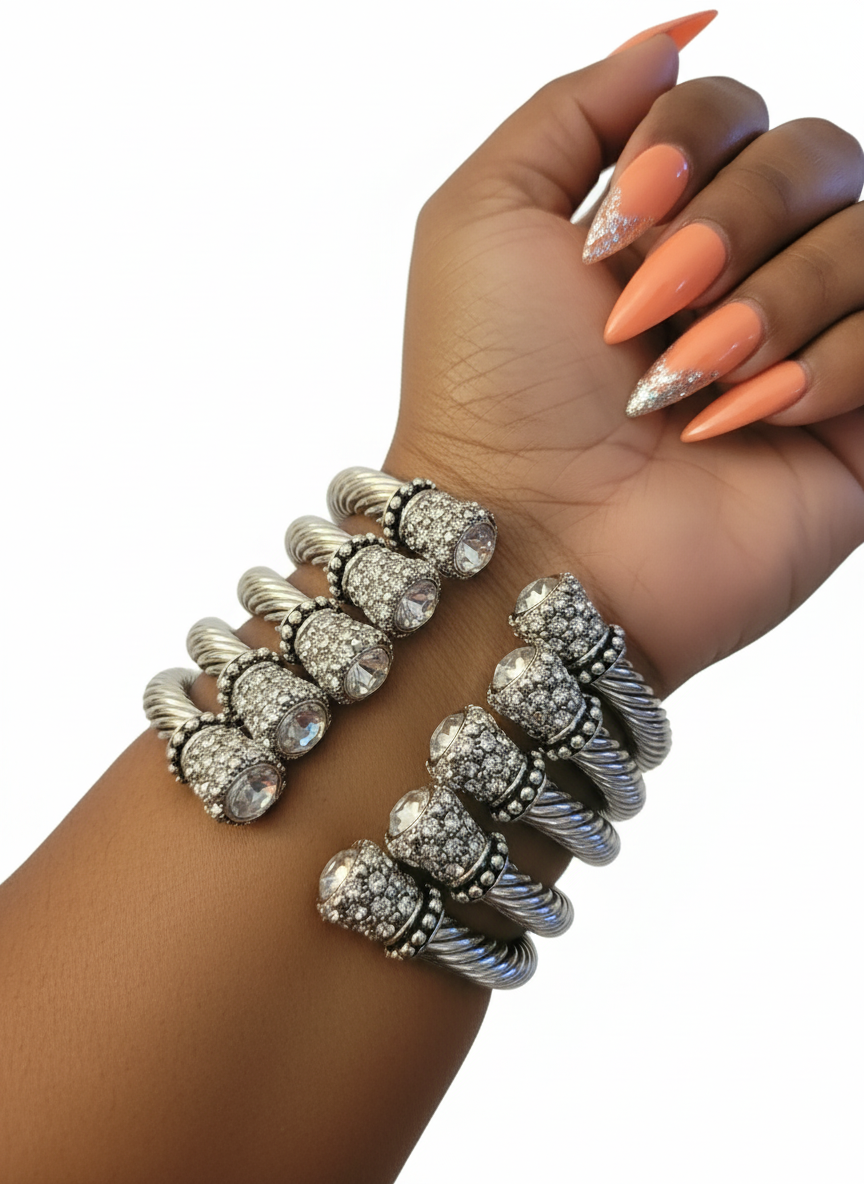 Get Stoned Cable Rope Stainless Steel Bangles Are Here! Time To Add A Little Metal To Your Look! They are very light to wear and will fit up to a 8 1/2 inch wrist. These are adjustable and can be adjusted out to fit a 9 inch wrist without compromising the style.